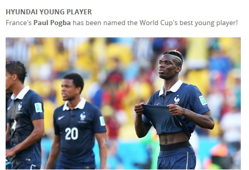 국제축구연맹(FIFA)은 14일 이번 월드컵 최고의 신인에게 주어지는 '현대 영플레이어상' 수상자로 포그바를 선정했다. 월드컵에 첫 출전한 21세 이하 선수 중 최고 활약을 펼친 선수에게 주어지는 상이다. 네덜란드의 멤피스 데파이(에인트호번), 프랑스 공격수 포그바(유벤투스), 프랑스 수비수 라파엘 바란(레알 마드리드)가 3파전을 펼쳤다. 영플레이어 상은 FIFA 기술연구그룹(TSG)이 해당 나이대의 선수들을 모두 후보에 올려 최종 후보 3명을 추린 뒤 나이, 기술, 플레이 스타일, 창의성, 대중성, 페어플레이 등을 모두 고려해 수상자를 결정한다. 포그바는 나이지리아와의 16강전에 선발 출전해 0-0이던 후반 34분 결승골을 터뜨리며, 맨오브더매치(MOM)에 뽑혔다.
