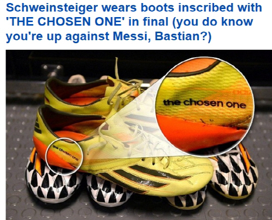 이날 슈바인슈타이거의 축구화에 새겨진 글귀는 '선택받은 자(The Chosen One)'이었다. 승리의 여신은 투혼의 독일을 브라질월드컵 우승팀으로 선택했다.