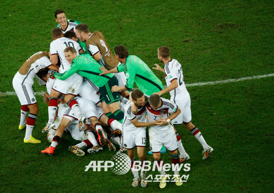 독일이 14일 오전(한국시간) 브라질 리우 데 자네이루의 에스타디오 두 마라카낭에서 열린 2014년 브라질월드컵 결승전에서 아르헨티나를 1-0으로 꺾고 우승컵을 들어올렸다. 연장 접전끝에 승리를 거둔 독일 선수들이 한데 뒤엉켜 기쁨을 나누고 있다.