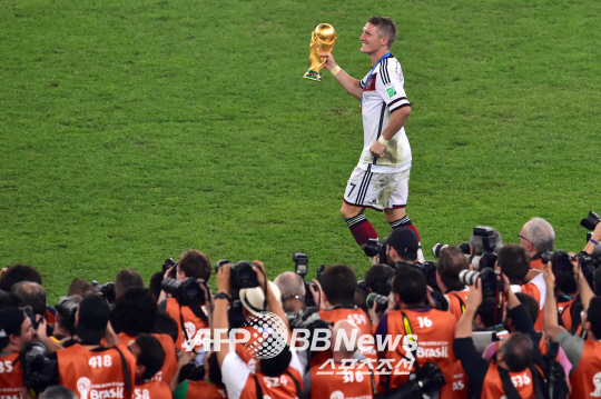 독일이 14일 오전(한국시간) 브라질 리우 데 자네이루의 에스타디오 두 마라카낭에서 열린 2014년 브라질월드컵 결승전에서 아르헨티나를 1-0으로 꺾고 우승컵을 들어올렸다. 독일의 미드필더 슈바인슈타이거가 우승컵을 들고 기뻐하고 있다.