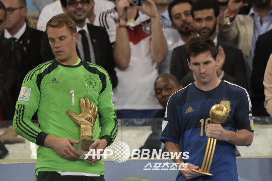 독일이 14일 오전(한국시간) 브라질 리우 데 자네이루의 에스타디오 두 마라카낭에서 열린 2014년 브라질월드컵 결승전에서 아르헨티나를 1-0으로 꺾고 우승컵을 들어올렸다. '골든글러브'를 수상한 독일 골키퍼 노이어(왼쪽)와 '골든볼' 수상자인 아르헨티나 메시가 트로피를 들고 있다.