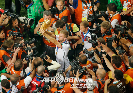 독일이 14일 오전(한국시간) 브라질 리우 데 자네이루의 에스타디오 두 마라카낭에서 열린 2014년 브라질월드컵 결승전에서 아르헨티나를 1-0으로 꺾고 우승컵을 들어올렸다. 독일은 1990년 이후 24년 만에 월드컵을 다시 품었다. 사진은 우승컵을 들고 사진기자들에 둘어 싸인 크라머.