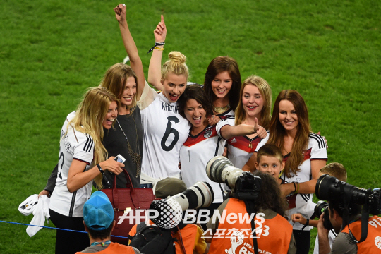 독일이 14일 오전(한국시간) 브라질 리우 데 자네이루의 에스타디오 두 마라카낭에서 열린 2014년 브라질월드컵 결승전에서 아르헨티나를 1-0으로 꺾고 우승컵을 들어올렸다. 독일은 1990년 이후 24년 만에 월드컵을 다시 품었다. 독일 대표팀 선수들의 부인과 여자친구들이 함께 모여 승리를 자축하고 있다.