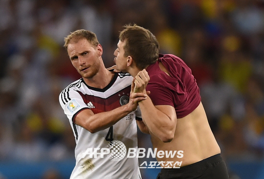 독일이 14일 오전(한국시간) 브라질 리우 데 자네이루의 에스타디오 두 마라카낭에서 열린 2014년 브라질월드컵 결승전에서 아르헨티나를 1-0으로 꺾고 우승컵을 들어올렸다. 독일은 1990년 이후 24년 만에 월드컵을 다시 품었다. 사진은 결승전 경기중 난입한 관중이 독일 수비수 베네딕트 호에베데스에게 키스를 하려는 모습.