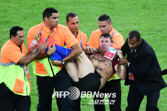 독일이 14일 오전(한국시간) 브라질 리우 데 자네이루의 에스타디오 두 마라카낭에서 열린 2014년 브라질월드컵 결승전에서 아르헨티나를 1-0으로 꺾고 우승컵을 들어올렸다. 독일은 1990년 이후 24년 만에 월드컵을 다시 품었다. 사진은 결승전 경기중 난입한 관중이 보안요원들에게 끌려 나가는 모습.