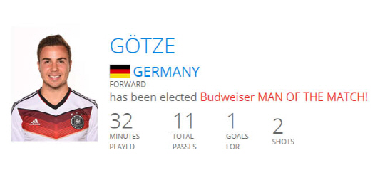 국제축구연맹(FIFA)도 결승골을 작렬시킨 괴체의 활약을 인정했다. FIFA는 결승전 MOM으로 괴체를 선정했다고 발표했다.