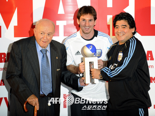 브라질월드컵 직전 아르헨티나의 승리를 기원하는 故 디스테파노-메시-마라도나(왼쪽부터). ⓒAFPBBNews = News1