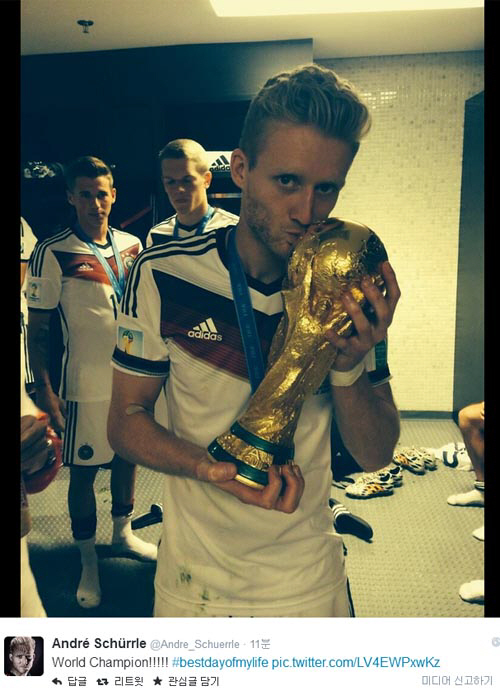 마리오 괴체(22)의 결승골을 어시스트한 안드레 쉬를레(24)가 감격의 우승컵 인증샷을 공개했다.