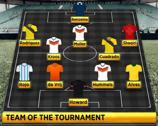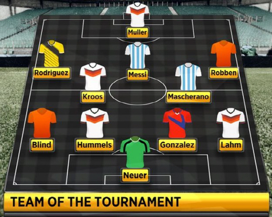 BBC는 최고의 골키퍼에 마누엘 노이어(독일), 수비진에 달레이 블린트(네덜란드)-마츠 훔멜스(독일)-지안카를로 곤살레스(코스타리카)-필립 람(독일), 중원에 토니 크로스(독일)-하비에르 마스체르노(아르헨티나), 공격진에 하메스 로드리게스(콜롬비아)-리오넬 메시(아르헨티나)-아르옌 로번(네덜란드), 그리고 최전방에 토마스 뮐러(독일)를 꼽았다. 우승팀 독일이 무려 5명이 선정됐고, 아르헨티나와 네덜란드가 2명, 콜롬비아-코스타리카가 1명씩이다.