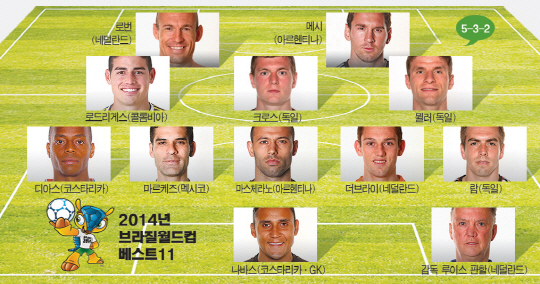 2014년 브라질월드컵이 독일의 통산 4번째 우승으로 막을 내렸다. 브라질을 누빈 32개국의 736명 중 가장 환하게 빛난 별 11명을 골라봤다. 포메이션은 이번 대회를 통해 새롭게 조명받은 5-3-2를 기준으로 했다.