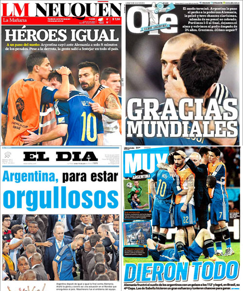 15일(한국 시각) 아르헨티나 신문들은 일제히 슬퍼하는 아르헨티나 축구대표팀의 사진들과 함께 "고맙다", "자랑스럽다", "고개 들어라" 등의 문구를 1면에 실었다.