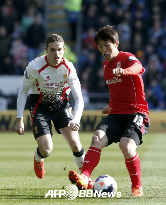 ◇김보경(오른쪽)이 지난 3월 23일 카디프시티 스타디움에서 펼쳐진 리버풀과의 2013~2014시즌 EPL 31라운드에서 리버풀 조던 헨더슨과 볼을 다투고 있다. ⓒAFPBBNews = News1