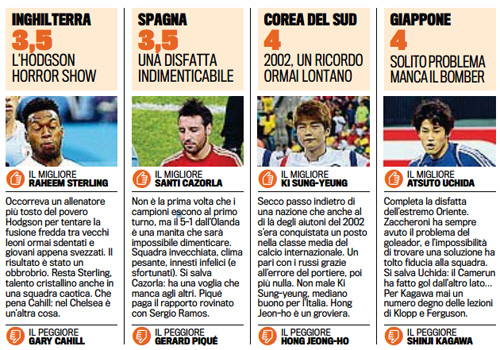 이탈리아 일간지 가제타 델로 스포르트는 16일 이번 월드컵에 참여한 각국의 평점과 베스트-워스트 선수를 꼽았다.