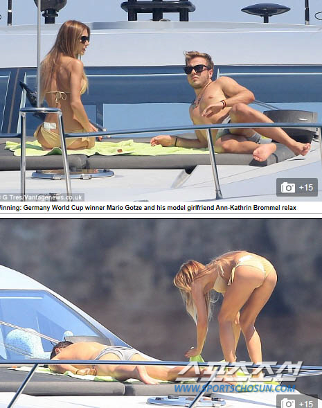 영국의 일간지 데일리메일은 괴체가 요트 위에서 일광욕을 즐기고 있는 사진을 17일(한국시각) 공개했다. 데일리메일에 따르면 괴체가 휴가를 보내고 있는 곳은 여자친구의 고향인 스페인의 이비자다. 사진에서 괴체와 브뢰멜은 수영복만 입은채 요트 위에 누워있다. 일광욕을 즐기고 있는 괴체를 위해 브뢰멜이 과일을 가져오는 모습도 포착됐다. 월드컵 우승 이후 휴가기간동안 우승의 기쁨을 한껏 누리고 있는 모습이다.