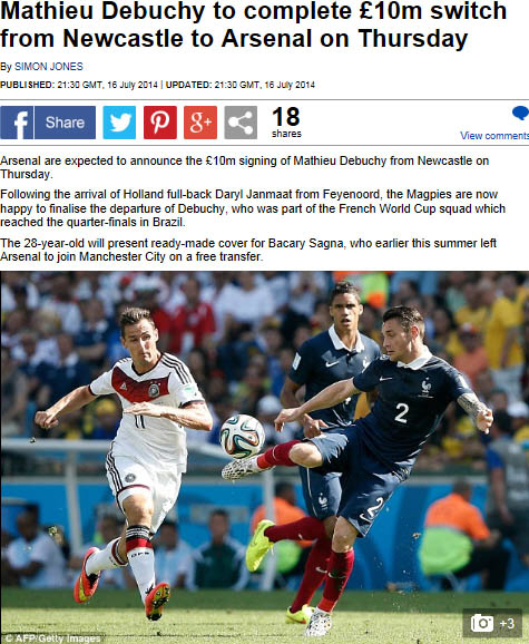 벵거 감독은 가장 먼저 마티유 드뷔시(뉴캐슬)의 영입을 확정했다. 영국의 일간지 데일리 메일은 17일(한국시각) '아스널이 드뷔시의 영입 발표를 앞두고 있다. 이적료는 1000만파운드(약 176억원)다'라고 보도했다. 오른쪽 풀백인 드뷔시는 프랑스 대표팀의 일원으로 2014년 브라질월드컵에 출전했다.