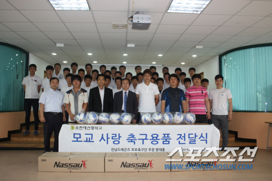 '전남 캡틴' 방대종이 21일 오전 모교 순천 매산중학교 축구부를 찾았다. 19일 성남과의 홈경기에서 시즌 첫 3연승을 달리며 K-리그 클래식의 '태풍'으로 자리잡은 직후다. 전남은 월드컵 휴식기 직후 4경기에서 3승1무로 무패를 달렸다. '3연승' 승리수당에 특별 보너스까지, 열심히 뛴 만큼 선수들의 주머니도 두둑해졌다. 방대종은 가장 행복한 순간, 가장 먼저 주변을 돌아봤다.후배들을 위한 300만원 상당의 축구공과 축구용품 등 선물보따리를 준비했다. "얼마전 선배로부터 모교 축구부 재정이 어렵다는 소식을 전해들었다. 축구공도 물품도 부족하다는 이야기에 가슴 아팠다"고 했다.
