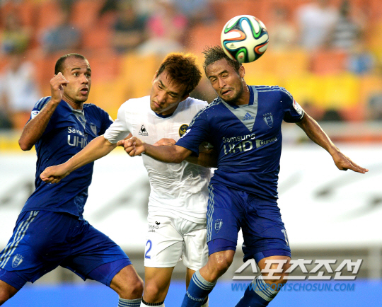 | ◇수원 산토스(오른쪽)가 19일 수원월드컵경기장에서 열린 인천과의 2014년 K-리그 클래식 16라운드에서 수비수 마크를 뿌리치고 헤딩슛을 시도하고 있다. 수원=정재근 기자 cjg@sportschosun.com |