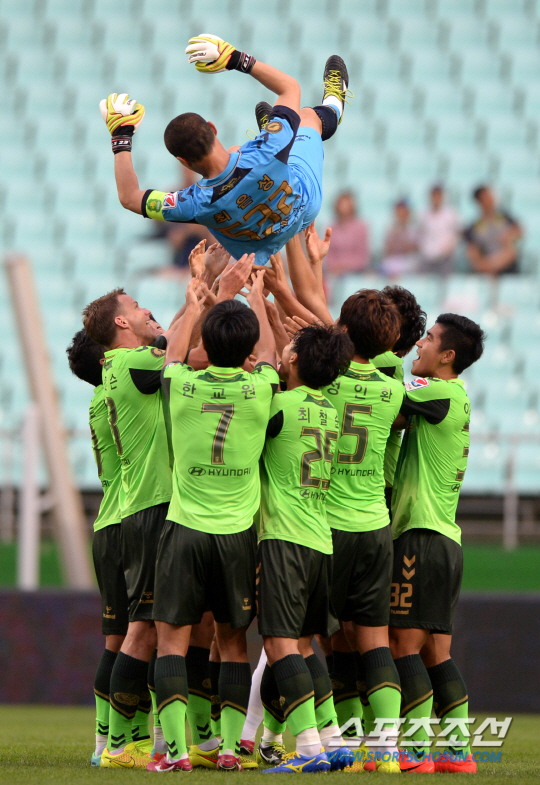 골 세리머니와 관련된 일화도 있었다. '헹가래 세리머니'는 기획-연기까지 모두 '라이언킹' 이동국의 작품이었다. 경기전 이동국이 라커룸에 있던 선수들을 불러 모았다. 보통 '깜짝 세리머니'는 주인공을 배제한채 각본이 쓰여진다. 이날은 달랐다. 최은성도 '세리머니 기획'에 적극 참여했다. 이동국이 "골을 넣으면 은성이형 헹가래를 해주자"고 선수들에게 제안하며 '노장' 최은성에게는 특별한 부탁을 했다. "우리가 골 넣으면 하프라인으로 오세요." 0-0으로 맞선 전반 17분 이동국의 선제골이 터졌다. 최은성은 후배들의 명령(?)대로 골대부터 하프라인까지 득달같이 뛰어 갔다. 세 번의 헹가래, 동료들과의 포옹 등 아름다운 세리머니가 펼쳐졌다. 경기를 마친 뒤 이동국과 함께 기자회견에 참석한 최은성이 웃음을 머금으며 세리머니 상황을 설명했다. "동국이가 생각해낸 세리머니다. 그런데 내가 하프라인까지 간 이유가 있었다. 10명의 선수가 골대까지 오기 힘들다더라. '한 명만 하프라인까지 오면 된다'며 나보고 오라고 했다." 후배들의 지시를 잘 따른 '코치' 최은성은 "동국이와 동료들이 특별한 세리머니를 해줘서 고마웠다"며 감사인사를 전했다.