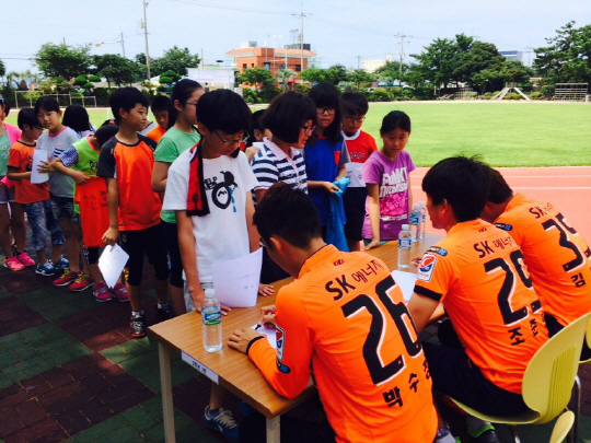 제주 유나이티드(SK 에너지 축구단)가 효돈초등학교에서 어린 꿈나무들과 즐거운 추억을 쌓았다.