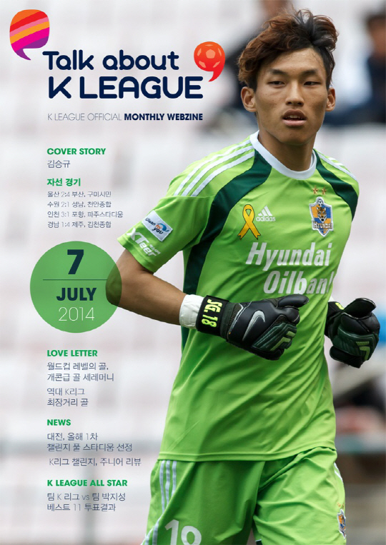 'K-리그 대세' 김승규(24·울산)이 K-리그 웹진 'Talk about K LEAGUE'의 7월호 커버스토리를 장식했다.