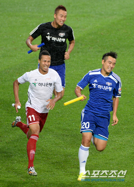 5만여 관중의 함성과 함께 스타트 총성이 울렸다. 올스타전을 위해 월급 14만8000원을 기름값으로 쏟아부어 상주에서 상암까지 트랙터를 타고 상경했다는 '육군병장' 이근호(상주)가 치고 나갔다. 매일 아침 구보로 단련된 강인한 하체는 다른 선수들이 따라 잡을래야 따라잡기 힘들었다. 이미 현역을 떠난 선수들이 대부분인 '팀 박지성'이 따라잡기엔 무리였다. 박지성과 이영표도 줄행랑 치는 후배들을 따라잡기 위해 이를 물로 뛰었지만, 헛웃음만 지을 뿐이었다.
