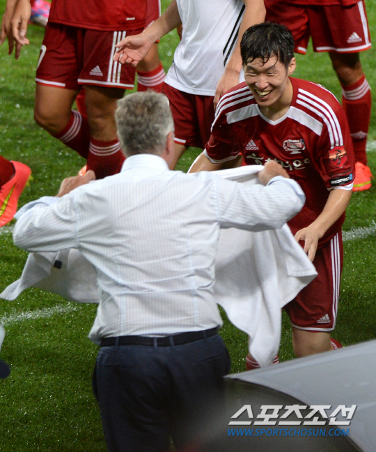 박지성은 25일 서울월드컵경기장에서 열린 2014년 하나은행 K-리그 올스타 with 팀 박지성에서 3-4로 뒤진 후반 13분 득점에 성공했다. 그는 잠시 뜸을 들였다. 그라운드에서 동료들과 기쁨을 먼저 나눴다. 그리고는 곧장 벤치에 있는 거스 히딩크 감독에게 뛰어 가 품에 안겼다. 2002년 한-일월드컵 포르투갈전에서 나온 세리머니와는 조금 달랐다. 히딩크 감독은 자신을 향해 달려오는 박지성을 껴 안고 수건으로 두 사람의 머리를 가렸다. 수건 속에서 둘만의 진한 포옹이 지속됐다. 업그레이드된 포옹 세리머니였다.