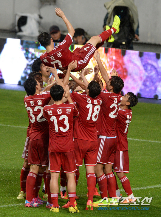 | K리그 올스타 with 팀 박지성이 25일 서울월드컵경기장에서 열렸다. 김현의 골때 선수들이 박지성을 행가레하고 있다. 상암=허상욱 기자 wook@sportschosun.com |