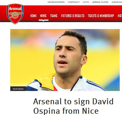 아스널은 27일(한국시각) 구단 공식 홈페이지를 통해 오스피나 영입을 발표했다. 이적료는 비공개다. 오스피나는 2014년 브라질월드컵에서 콜롬비아를 8강으로 이끌며 많은 주목을 받았다. 뛰어난 반사신경과 공중볼처리 능력을 과시했다. 프랑스 리그1 니스에서도 좋은 모습을 보였다.