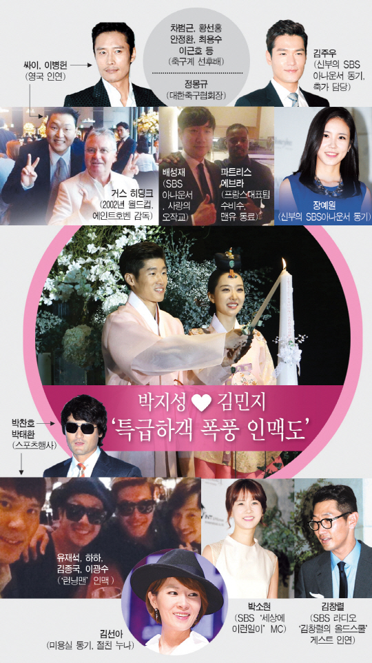 27일 오후 서울 광장동 쉐라톤 워커힐 호텔에서 열린 '지느님' 박지성(33)과 김민지 전 SBS 아나운서(29)의 결혼식에는 대한민국 연예, 스포츠 스타들을 포함한 '특급하객'들이 총출동했다. 부장판사 출신 신부 아버지와 미대 교수 출신 신부 어머니의 인맥으로 내로라하는 법조, 예술계 인사들도 식장을 찾았다. 그라운드뿐 아니라 방송, 연예계를 총망라해 오랜 기간 국내외를 넘나들며 굳건히 쌓아온 '폭풍 인맥'이 화제가 됐다. 박지성-김민지 커플과 '특급하객'들의 특별한 인연을 살폈다.
