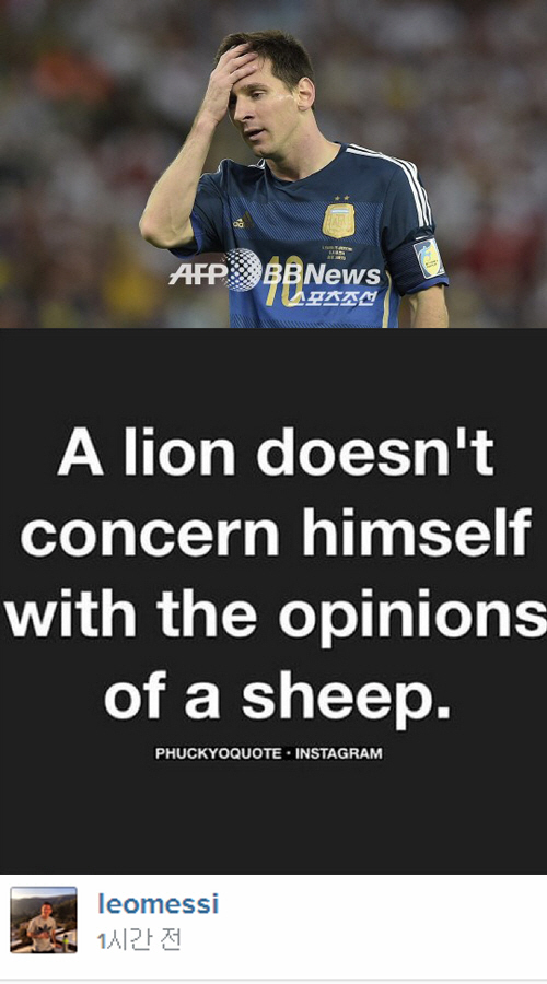 메시는 29일 자신의 SNS에 "사자는 양의 의견 따위에는 관심을 두지 않는다(A lion doesn't concern himself with the opinions of a sheep)"라는 경구를 올려 복잡한 심경을 드러냈다.