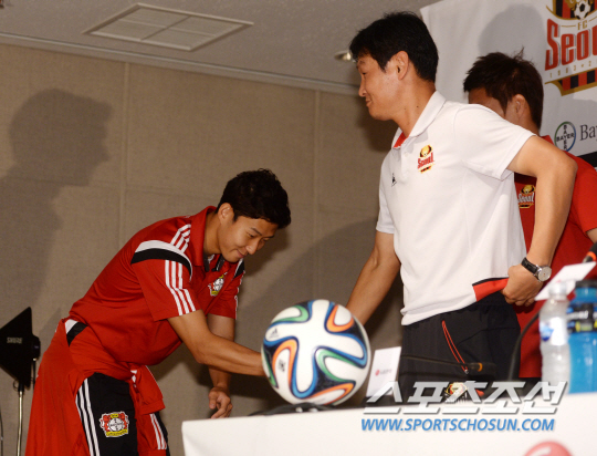 손흥민과 류승우가 뛰는 독일 분데스리가 명문구단인 바이엘 레버쿠젠이 FC서울과의 친선경기를 위해 입국했다. 경기를 펼칠 양팀 감독과 선수들이 29일 서울월드컵경기장에서 기자회견을 가졌다. 최용수 감독과 손흥민이 인사를 나누고 있다. 레버쿠젠은 30일 오후 7시 서울월드컵경기장에서 열리는 'LG전자 초청 FC서울-바이엘 04 레버쿠젠 친선경기'에서 서울과 맞붙는다. 이번 맞대결은 레버쿠젠의 공식 스폰서 LG전자가 레버쿠젠을 한국으로 초청해 이뤄지게 됐다. 이번 방한에는 로저 슈미트 레버쿠젠 감독과 손흥민, 류승우와 더불어 슈테판 키슬링, 베른트 레노 등 주요 선수들, 코칭스태프 등 40여명이 함께한다. 상암=허상욱 기자 wook@sportschosun.com/2014.07.29/