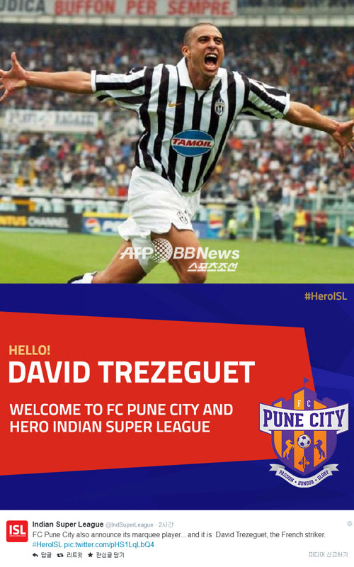 인도 슈퍼리그 측은 30일 공식 트위터를 통해 "FC 푸네 시티가 엄청난 선수를 영입했다. 프랑스 스트라이커 다비드 트레제게"라고 공지했다.