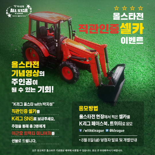 '하나은행 K-리그 올스타 with 팀 박지성' 후속 영상 제작에 활용될 계획이며, 이 중 가장 개성있는 사진을 남겨준 팬 3명에게는 이근호가 운전했던 트랙터 미니어처도 경품으로 증정할 예정이다.