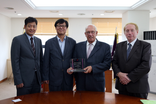 레이몽드 랑겐드리 AFC 투비즈 구단주가 5일 한국프로축구연맹을 예방했다. 한웅수 연맹 사무총장은 랑겐드리 구단주에게 방문 기념패를 전달했다. 왼쪽부터 심찬구 스포티즌 대표, 한웅수 연맹 사무총장, 랑겐드리 구단주, 장 마리 덴젤 부사장. 사진제공=한국프로축구연맹