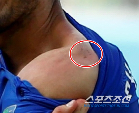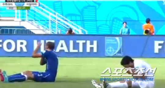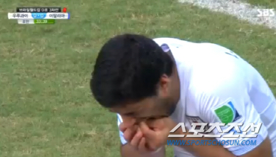 이빨 자국이 너무도 선명했다. 25일 새벽(한국시각) 브라질 나타우 에스타디오 다스 두나스에서 열린 이탈리아와 우루과이의 2014년 브라질월드컵 D조 최종전, 0-0으로 팽팽하던 후반 34분 '우루과이 공격수' 루이스 수아레스(리버풀)가 문전 몸싸움 중 느닷없이 조르지오 키엘리니의 왼쪽 어깨를 깨물었다. 브라질월드컵에서 공포의 '핵이빨'을 재가동했다. 키엘리니는 쓰러졌고 수아레스 역시 입을 감싸며 쓰러졌다. 마치 고의가 아닌 실수로 이를 부딪친 것처럼 행동했다. 느린 화면에는 수아레스가 어깨를 무는 장면이 정확히 포착됐다. 안타깝게도 주심은 물론 부심도 이 장면을 보지 못했다. 카드가 나오지 않았다. 키엘리니가 어깨에 선명한 이빨 자국을 보여주며 반칙을 주장했지만, 받아들여지지 않았다. 이날 우루과이는 후반 37분 고딘의 헤딩 결승골에 힘입어 1대0으로 이겼다. 극적인 16강행을 확정했다. 그러나 16강행의 기쁨보다 수아레스 '핵이빨'의 충격과 부끄러움이 컸다.