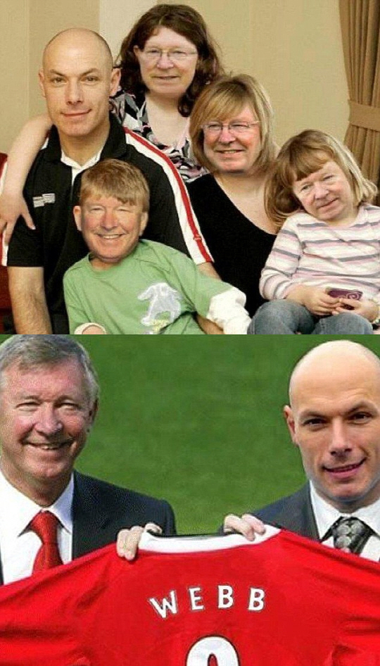 맨유 유니폼을 입고 뛰는 건 양반이고 자녀와 부인의 얼굴을 온통 퍼거슨 감독 얼굴로 바꿔놓은 가족사진은 폭소를 유발한다.