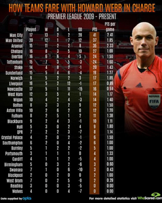 이같은 상황에서 영국 통계 매체 후스코어드닷컴은 2009년 이후 웹이 주심을 맡은 EPL 경기를 분석해 팀별로 획득한 승점을 공개했다.