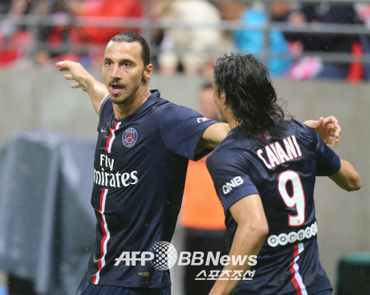 ◇즐라탄 이브라히모치(왼쪽)가 9일(한국시각) 프랑스 리그1 개막전에서 선제골을 터트린 후 팀 동료 카비니와 함께 기뻐하고 있다. 랭스(프랑스)=ⓒAFPBBNews = News1
