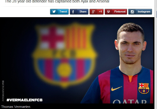 맨유와 바르셀로나에 영입 전쟁에서 중간에 섰던 아스널의 수비수 베르마엘렌가 바르셀로나로 이적했다. 바르셀로나는 10일(한국시각) 공식 홈페이지를 통해 베르마엘렌 영입을 발표했다. 계약기간은 5년이다.