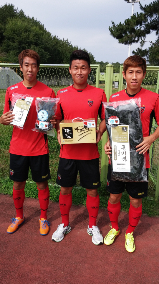 포항 구단은 11일 구룡포 수협과 함께 한가위 추석 선물세트를 출시했다고 밝혔다. 추석 선물세트는 '챔피언세트'라는 이름으로 3호와 5호, 10호로 구성되어 있다. 포항 지역 특산물인 마른오징어, 볶음용 세멸치, 자연산 돌미역, 홍게간장, 천연미네랄 소금이 공통적으로 포함되고 각 세트의 특성에 따라 돌김, 국물용 멸치 등이 추가 된다. 대량 구매에 따라 세트당 1000원에서 5000원까지 할인 혜택이 주어진다. 또 50개 이상 주문할 경우 주문자가 디자인을 선택할 수 있도록 한 점이 특징이다. 챔피언세트는 포항 구단 홈페이지에서 확인할 수 있으며, 구입은 포항 마케팅팀(054-282-2063)을 통해 할 수 있다.