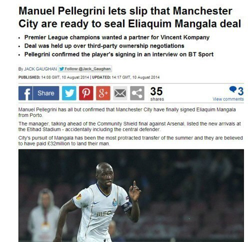 페예그리니 감독은 BT Sport와의 인터뷰에서 "맨시티는 강한 선수단을 보유하고 있다. 여기에 수비 영입은 우리는 더 강하게 만들 것"이라고 밝혔다. 이미 맨시티는 페르난도, 카바예로, 바카리 사냐 등을 영입해 수비진을 보강했고, 여기에 망갈라까지 합류할 경우 더블 스쿼드를 보유하게 된다.