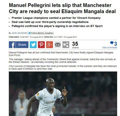 마누엘 페예그리니 맨시티 감독은 올 여름 빈센트 콤파니의 파트너를 찾던 중 그 대상으로 망갈라를 지목한 것으로 전해졌다. 만수르 구단주의 자금을 등에 업은 맨시티는 망갈라 영입을 위해 3200만 파운드(약 554억원)를 사용할 예정이다.