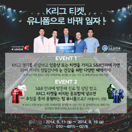 이번 이벤트는 K-리그 공식 지정 안과인 압구정S&B안과와 함께 진행한다. 참가 방법은 11일부터 오는 9월 12일까지 2014년 현대오일뱅크 K-리그 참가 구단의 시즌권 또는 7월부터 9월까지 2달 간의 경기 관람을 확인할 수 있는 예매권, 인증샷, 입장권을 갖고 S&B안과를 방문하면 된다. S&B안과는 이벤트 참가자 전원에게 51가지 안과 정밀검사 및 눈 건강을 위한 다양한 혜택을 제공할 예정이다. 프로연맹은 응모자 중 5명에게 응원팀 레플리카 유니폼을 증정할 계획이다. S&B안과 관계자는 "그동안 쌓은 노하우를 바탕으로 한국 축구 발전에 기여하겠다. 앞으로 K-리그 구성원은 물론 축구를 사랑하는 팬을 위한 다양한 활동을 펼치겠다"고 말했다.