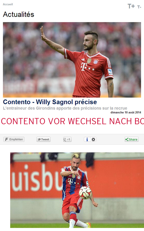 콘텐토는 지난 2009년 프리시즌, 감격의 뮌헨 1군 데뷔전을 가졌다. 하지만 이후 뮌헨의 두터운 수비진을 뚫지 못했고, 2013-14시즌까지 5년간 49경기 출전에 그쳤다. 결국 콘텐토는 프랑스에서 새로운 인생을 설계하게 됐다.