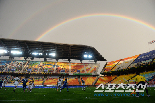 선두권 도약을 노리고 있는 수원과 제주의 K리그 클래식 2014 20라운드 경기가 10일 수원월드컵경기장에서 열렸다. 수원월드컵경기장 하늘에 무지개가 뜨며 아름다운 모습이 연출되고 있다. 수원은 9승 5무 5패(승점 32점)으로 3위를 달리고 있고 제주는 8승 7무 4패(승점 31점)으로 4위를 달리고 있다. 수원=허상욱 기자 wook@sportschosun.com/2014.08.10/