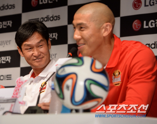 손흥민과 류승우가 뛰는 독일 분데스리가 명문구단인 바이엘 레버쿠젠이 FC서울과의 친선경기를 위해 입국했다. 레버쿠젠과 경기를 펼칠 FC서울이 29일 서울월드컵경기장에서 기자회견을 가졌다. 최용수 FC서울 감독이 독일어로 인사말을 하는 차두리를 흐뭇하게 지켜보고 있다. 레버쿠젠은 30일 오후 7시 서울월드컵경기장에서 열리는 'LG전자 초청 FC서울-바이엘 04 레버쿠젠 친선경기'에서 서울과 맞붙는다. 이번 맞대결은 레버쿠젠의 공식 스폰서 LG전자가 레버쿠젠을 한국으로 초청해 이뤄지게 됐다. 이번 방한에는 로저 슈미트 레버쿠젠 감독과 손흥민, 류승우와 더불어 슈테판 키슬링, 베른트 레노 등 주요 선수들, 코칭스태프 등 40여명이 함께한다. 상암=허상욱 기자 wook@sportschosun.com/2014.07.29/ |