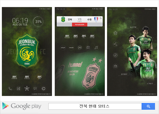 전북의 엠블럼과 이동국 이승기 등 주요선수들의 배경화면으로 설정된 전북 버즈런처는 홈페이지, 페이스북, 트위터, 유트브 등 최신 콘텐츠도 한번에 접할 수 있다.