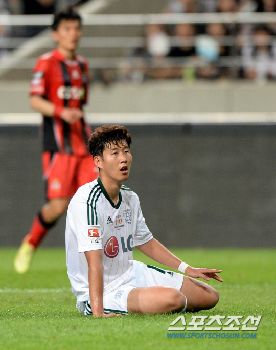손흥민과 류승우가 뛰고 있는 바이엘 04 레버쿠젠이 서울과 맞붙었다. 30일 서울월드컵경기장에서 열린 FC서울과 바이엘 04 레버쿠젠의 경기에서 손흥민이 돌파를 시도하다 찬스를 놓친 후 아쉬워하고 있다. 상암=허상욱 기자 wook@sportschosun.com/2014.07.30/