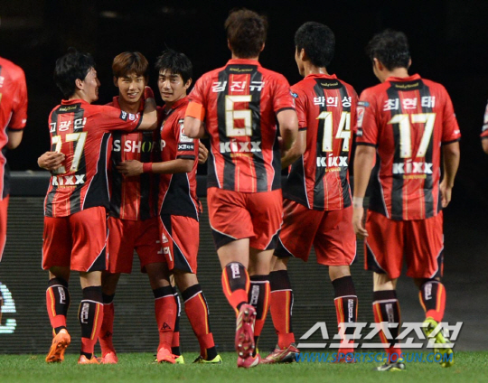 FC서울과 인천 유나이티드의 K리그 클래식 2014 21라운드 경기가 16일 서울월드컵경기장에서 열렸다. 서울 윤일록이 전반 선제골을 터뜨린 후 기쁨을 나누고 있다. 상암=허상욱 기자 wook@sportschosun.com/2014.08.16/