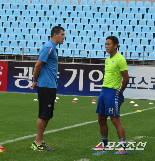 17일 전남 광양전용구장에서 펼쳐질 K-리그 클래식 21라운드 전남-수원전을 앞두고 경기 전 몸을 풀기 위해 그라운드에 나선 정대세와 스테보는 서로를 보고 반색했다. 부슬부슬 빗방울이 떨어지는 데도 아랑곳하지 않고 수원 벤치 앞에서 마주선 채 한동안 즐겁게 담소를 나눴다. 지난해 수원에서 함께 뛰며 공격라인을 이끌었던 정대세와 스테보가 수원 출신 스테보는 올시즌 전남 유니폼을 입었다. 계약에 따라 수원 원정경기는 나설 수 없지만, 수원과의 홈경기는 뛸 수 있다. 이날 스테보와 정대세는 나란히 선발명단에 이름을 올렸다. 1년만에 적으로 만난 절친 공격수 대결의 결과에 K-리그 팬들의 관심이 쏠리고 있다. 광양=전영지기자 sky4us@sportschosun.com